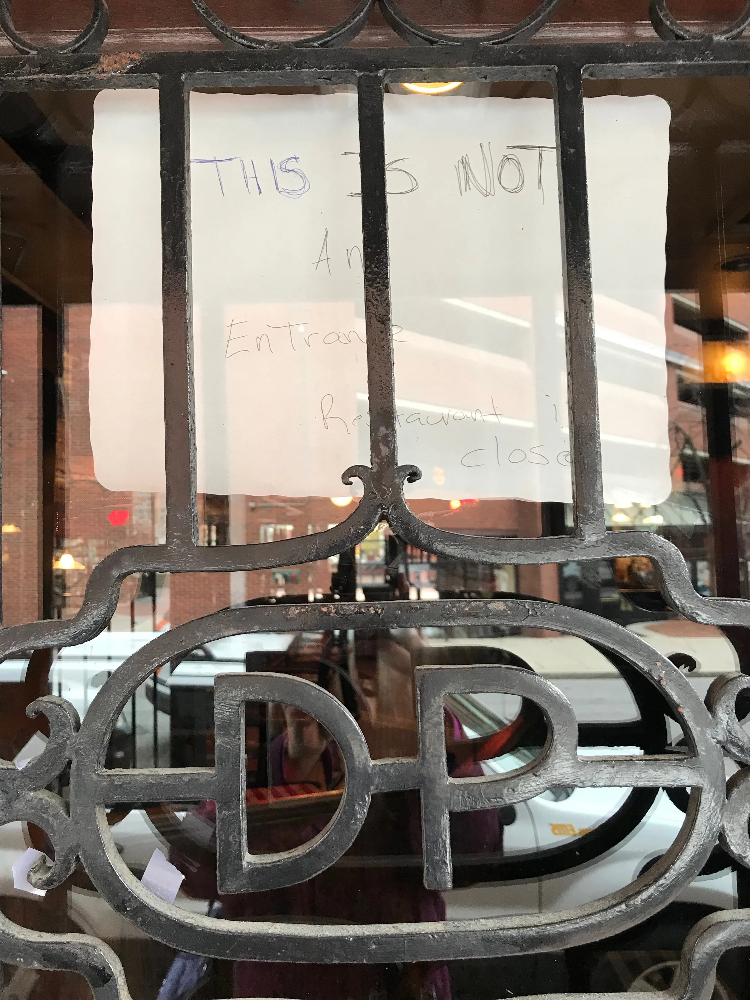 A handwritten note scrawled on the back of a paper placemat and taped to the the Clinton Street entrance door, behind the restaurant’s black, wrought iron D-P door grate. Photo: Karen Bento