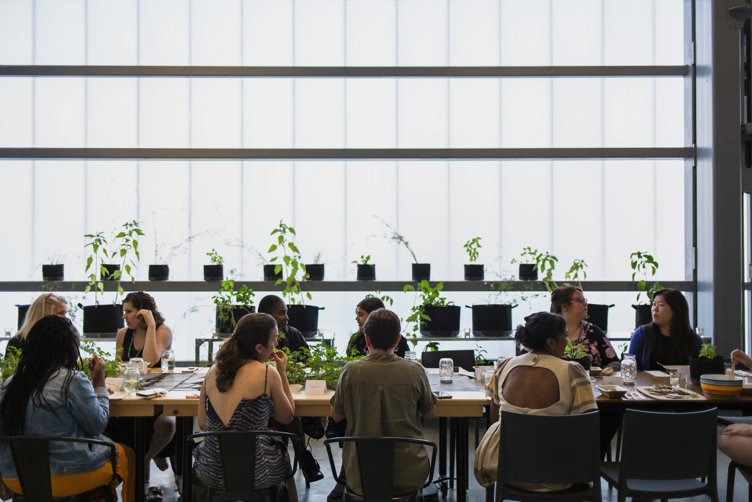 Rydz designed long rectangular tables fashioned with headphones which invite visitors to pull up a chair and listen to recordings of Comida Casera participants telling their personal, inspirational stories. In the center of each table a slab of thick, grey cement sports deep cracks, out of which spring bright green herbs, weeds and flowers planted by Eastie Farm. Potted plants—including many edible species—line the back of the space, inviting visitors to pick and to taste. The installation includes cards and pencils so visitors can reflect on their own stories and share with others. Rydz includes participatory elements like this in many of her projects.