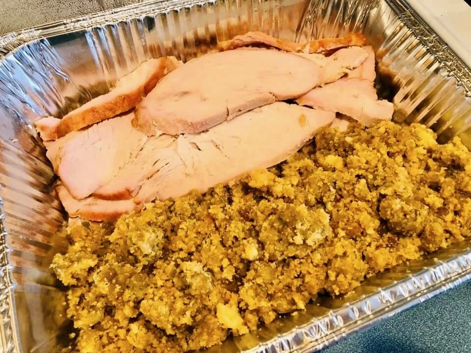 Family style portions of thickly sliced turkey breast and homemade stuffing ready to be delivered to Open Table. Photo: The Wayside Inn Foundation