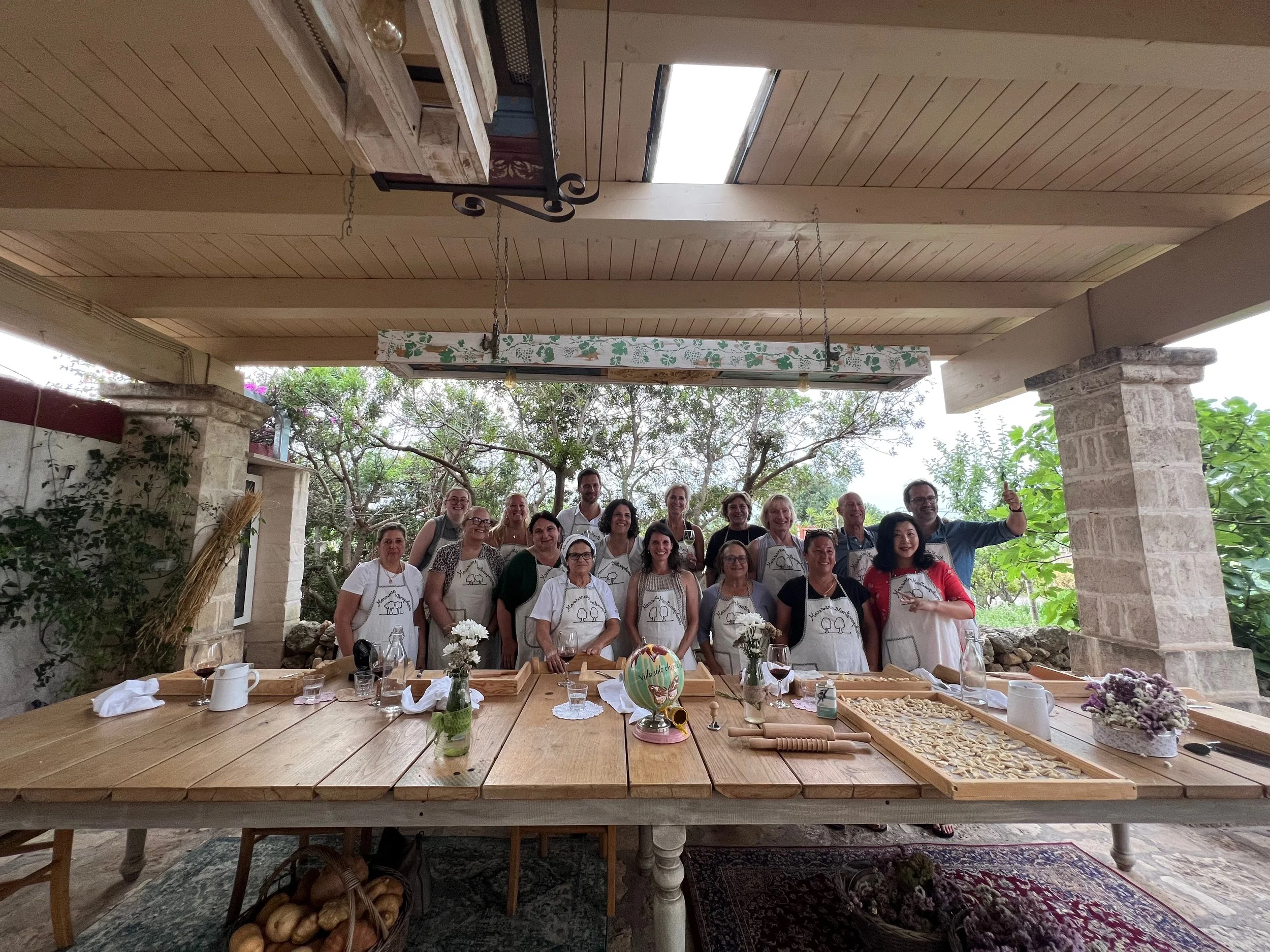 Up early and on the road, we headed for our Masseria in Puglia, a solid five-hour drive from Sorrento. After picking up our big, comfortable coach bus (and her Neopolitan driver, Pasquale) on the outskirts of town, we made our first stop in the region of Benevento, northeast of Naples in the hills of Campania, where Linda promised us a big surprise. And what a surprise it was! She had arranged a private cooking class at Krèsios, a 2-Michelin starred restaurant in Telese Terme, owned by her friend, chef Giuseppe Iannotti. Krèsios is known the world over for its intricate, technical, modern molecular gastronomy—but that is not what we were there for. Instead, we were treated to the kind of cooking Iannotti’s mother and grandmother taught him: the basics, the fundamental recipes of Campania. After a snack of cured tuna prosciutto and some focaccia Barese, Chef Iannoti gave us a quick demo on preserving egg yolks in salt, and then we a lesson in pasta making and stuffing—tortelli filled with ricotta di bufala e spinaci, plus veal meatballs in long-cooked tomato sugo. A Sunday supper-turned-haute cuisine, and it was just as delicious as it sounds. The restaurant itself, set alone on a country road surrounded by vineyards and its extensive kitchen garden, was an elegant respite from the heat of the day. The perfect sustenance for the long drive ahead—and the Masseria Montenapoleone at the end was worth every minute in the coach. A wine tasting, a supper of grilled vegetables with fresh cheese, beetroot risotto (and more local fruit than any of us could fathom), a walk around the grounds and a good night’s sleep for the Puglia-touring to come.