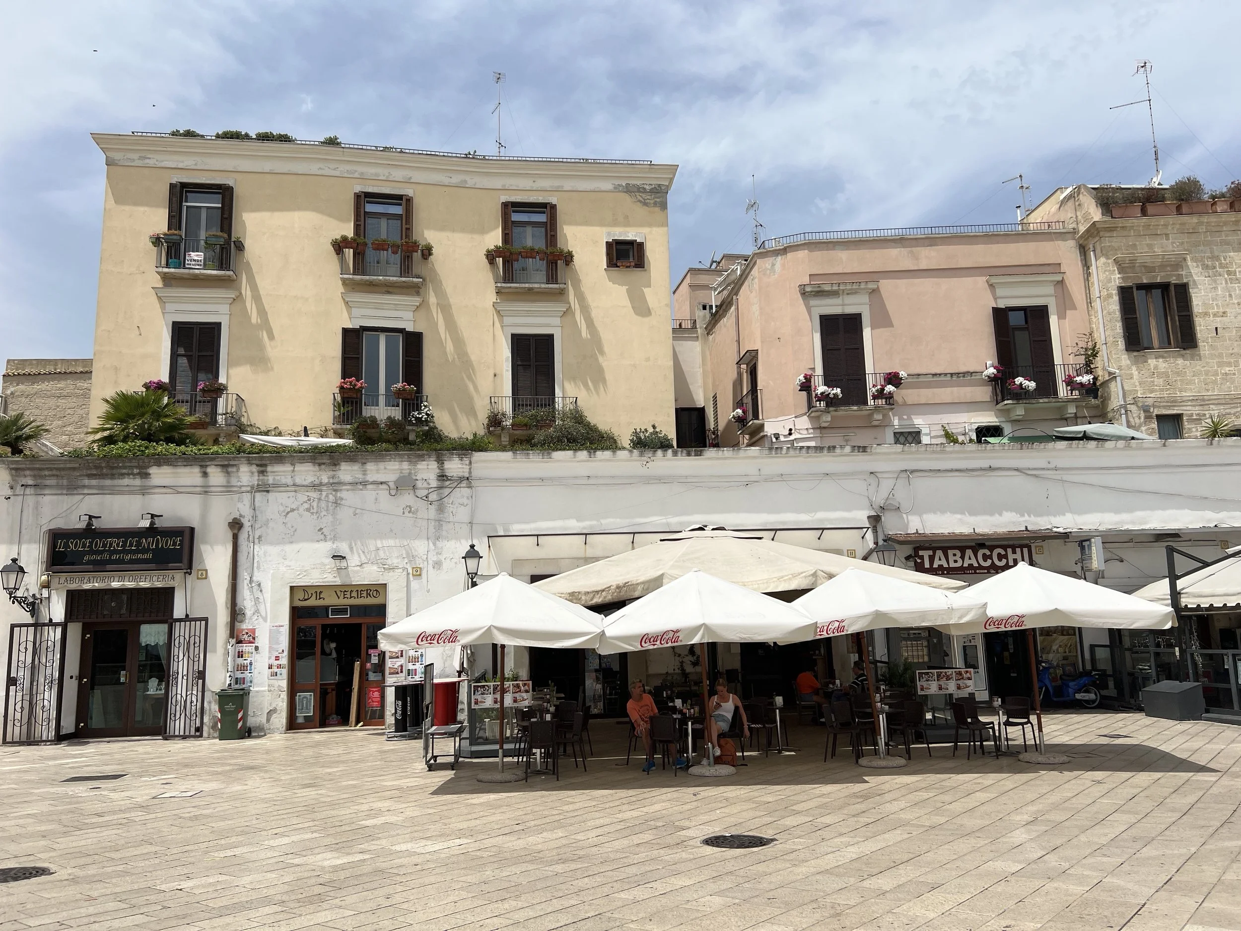 On our fourth day we hit the ground running and headed for Castello Monaci, a vineyard and winery doing a booming business in weddings (in fact, the whole time we were in Italy there were weddings galore—sometime three at a venue in a single day, on weekdays and weekends alike, to make up for lost pandemic celebrations. It was a very festive time!) We toured the stunning castle grounds in 100° heat, then escaped to the cool of the cave for a tasting of their glorious Fiano and Negroamaro alongside a delicious lunch of regional specialties, like a tray of melanzana in bianco (eggplant parm without tomato) and fave e cicoria (a platter of garlicky, slow-cooked chicory greens with a buttery puree of dried fava beans). Back on the bus and off to Antica Masseria Brancati for a stroll through an olive grove planted by the Romans over 2500 years ago. We descended under the Masseria (farmhouse) into a subterranean stone press where people have been pressing olives for millennia; then we tasted oils of differing purity and learned about the health benefits and flavor profiles of their high-quality extra virgin oil. And once again off we went, to our last stop of this busy day, for a historical walking tour of Ostuni, the white city. We had truly earned our aperitivo.