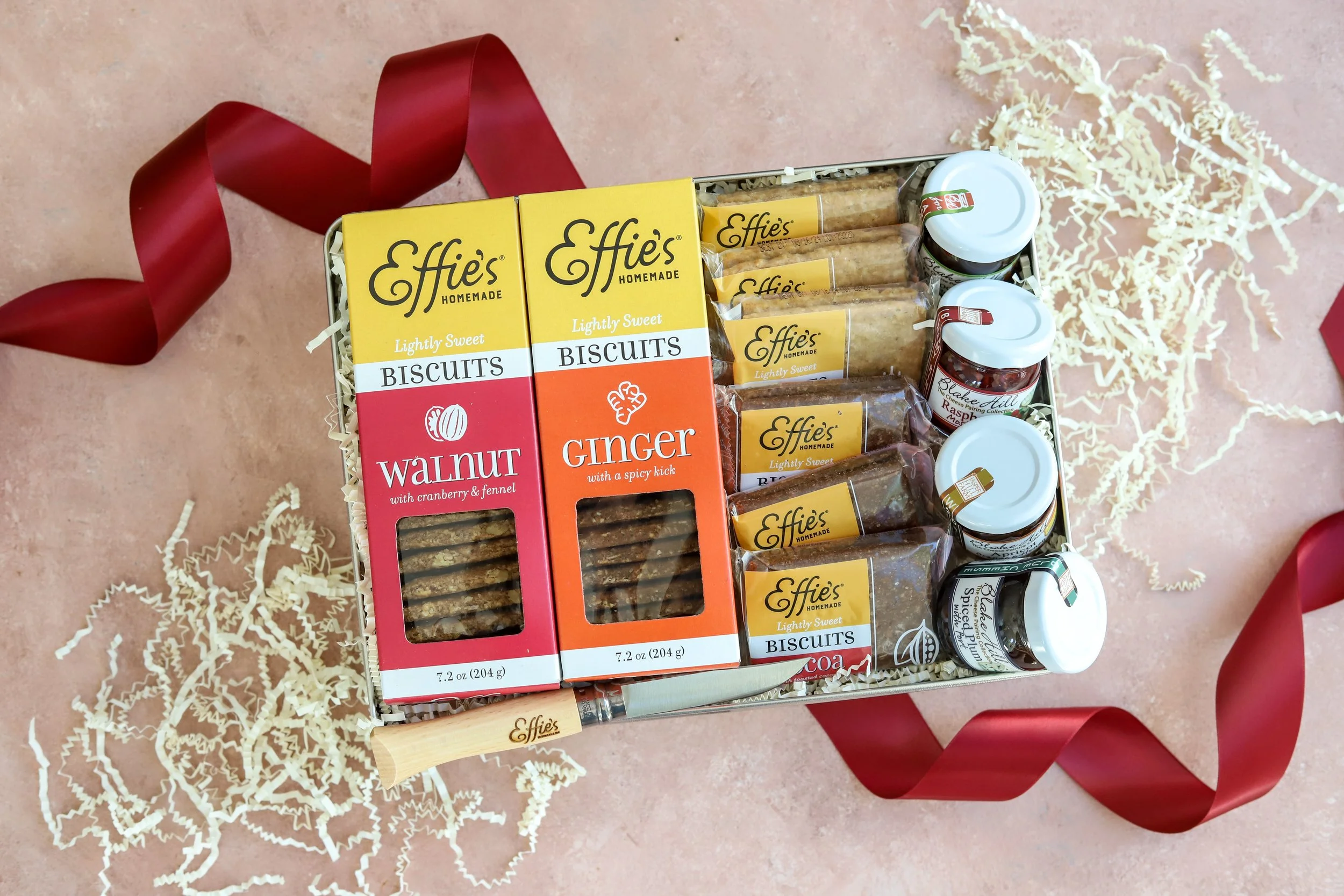 Whether you’ve already started on your gift-giving list or love an idea to file away for when you’re ready, Effie’s has you covered with our holiday gift collection. From our new Perfect Pairings Snack Stash gift tin featuring a delectable selection of buttery biscuits, seasonal Blake Hill jams and a custom stainless steel Opinel cheese knife, to our Gift Box Samplers, Effie’s has the perfect gift for cheese lovers, tea drinkers, biscuit aficionados or anyone who enjoys gourmet snacking…including yourself!