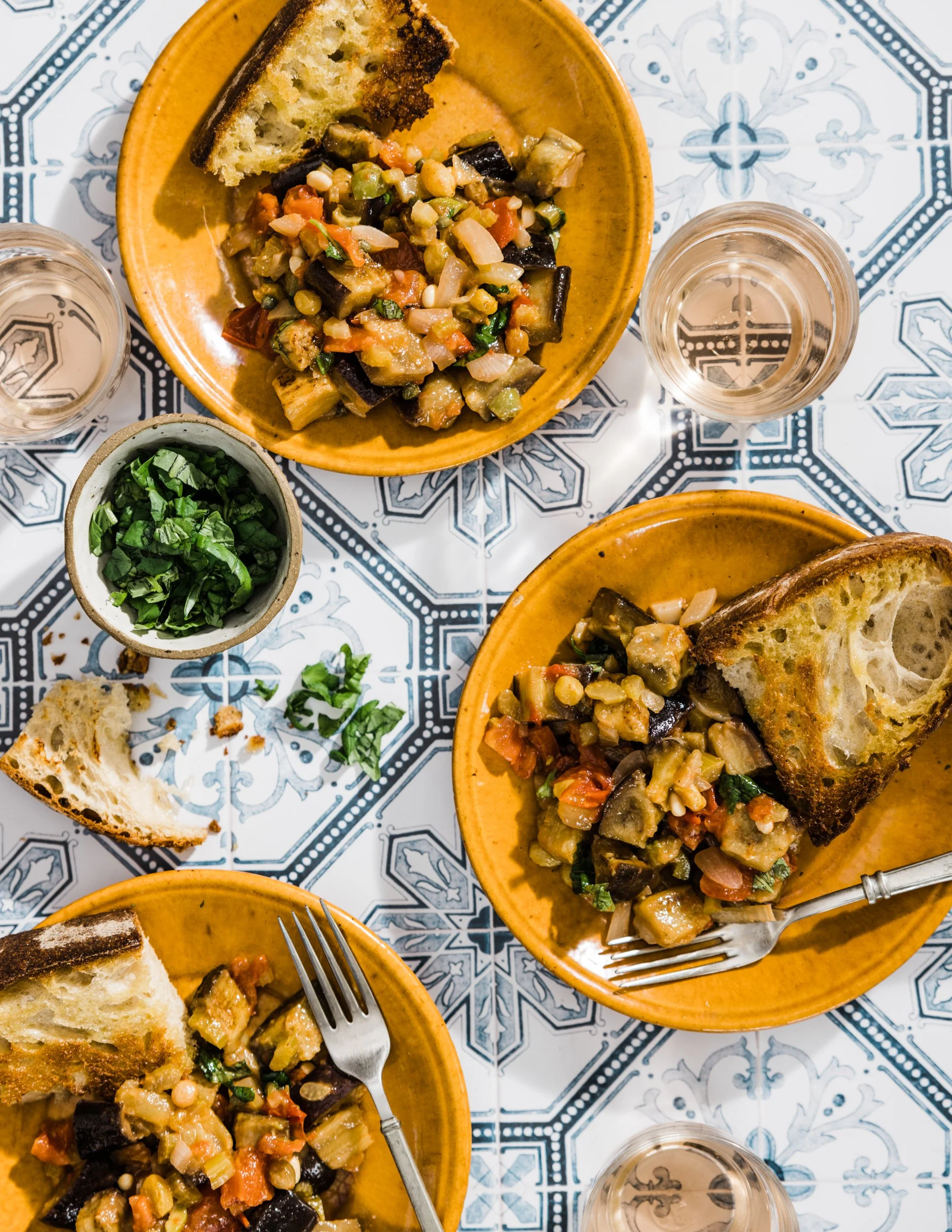 Late summer, when the farmers market is brimming with ripe tomatoes and eggplants, is the perfect time for this Sicilian antipasto. A cousin of French ratatouille, caponata’s defining characteristic is its harmonious blend of contrasting flavors. Sugar and golden raisins provide sweetness, vinegar adds a tangy punch and delightful bursts of saltiness come from capers and olives. Salting the eggplant is a worthwhile step as it breaks down the cells, preventing it from absorbing too much oil. For optimal flavor-melding, caponata is best made ahead and refrigerated for a day or two. Serve on its own, as a topping for grilled bread, or alongside grilled chicken or fish.