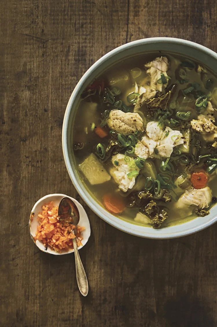 Remove the whole fish from the cheesecloth, flake flesh and discard bones; return fish to the pot. Serve, garnishing each portion with more scallions and optional minced Scotch bonnet pepper for added spice.