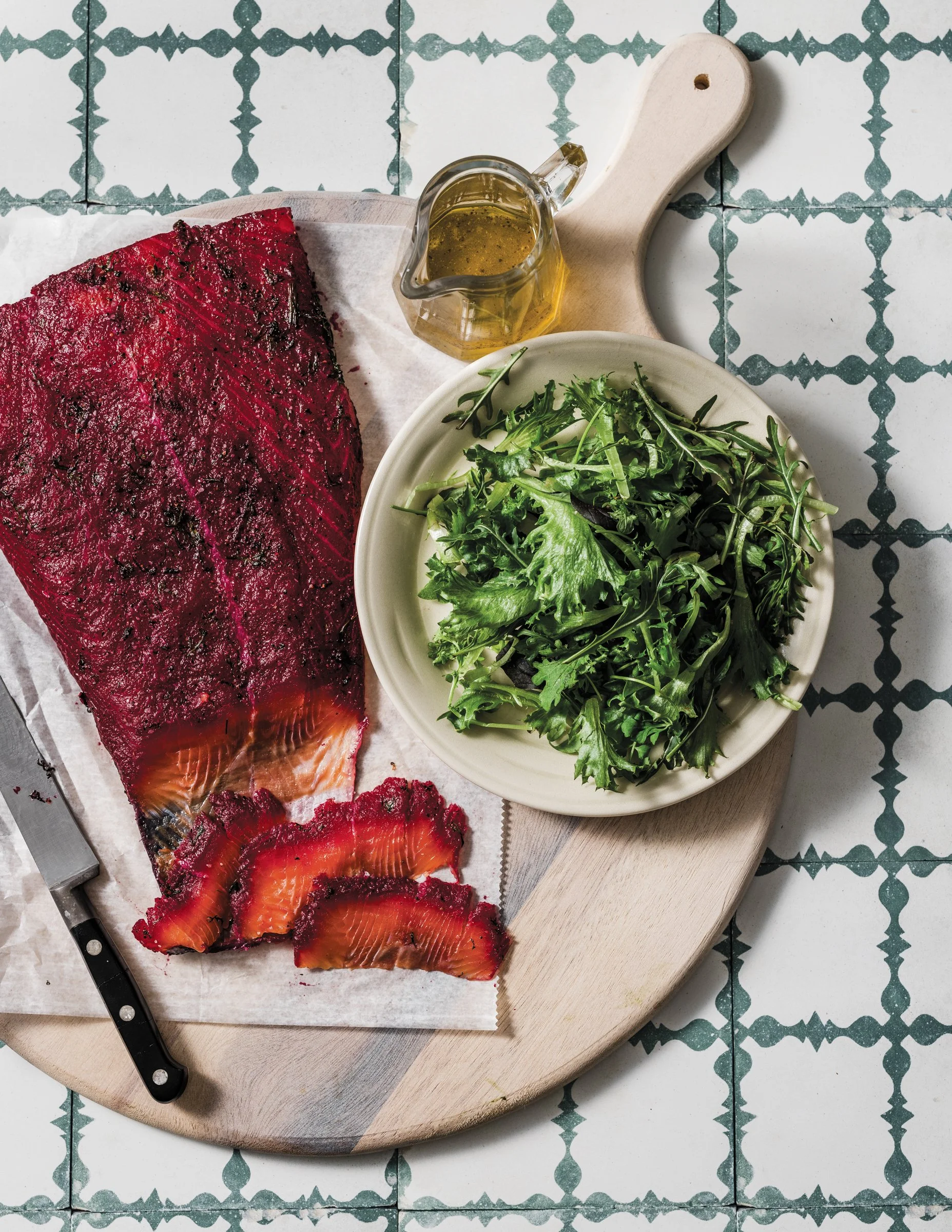 Making cured salmon from scratch is a lot less fussy than you think. You start building flavors by toasting some aromatic spices that you likely already have in your pantry. Beets provide the brilliant color and add an unexpected touch of sweetness. This recipe is in it for the long game in that you can store-and-eat for up to a week. The baby greens salad is simple to add and is a traditional pairing with cured salmon.
