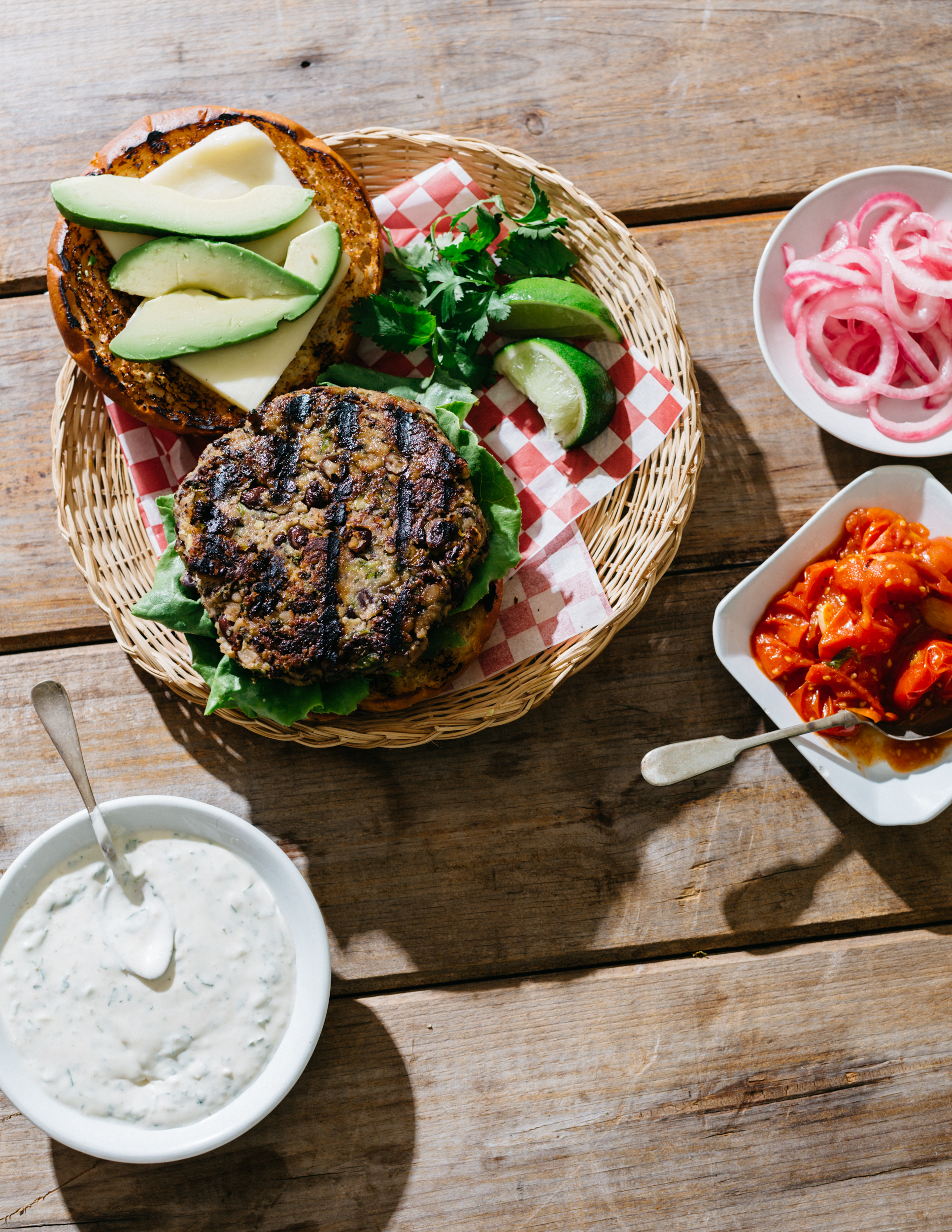While the ingredient list is long, this is a veggie burger even the most carnivorous will enjoy, so it’s worth the extra trouble. Crispy on the outside, creamy on the inside, it’s topped with all the flavors of Mexico. You can also serve these burgers on a fried corn tortilla as a tostada, or even over a bed of tomato-enriched Mexican-style rice. The instructions below involve cooking dried beans from scratch, using the incredible black beans from Charlie Baer’s South Hamilton, MA farm, but as a shortcut you can certainly use canned ones. Just use two cans’ worth, and be sure to rinse and drain them well before proceeding with the recipe.